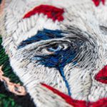 ‘Long and short stitch is my go-to filler. I rarely have just one colour of thread in the needle: two very similar tones help to create the graduated shading. The more the drawing is ‘disappeared’, the more therapeutic and satisfying I find the process. I use a variety of hoops depending on the size of the piece. The Joker took approximately 40 hours over the course of a month to complete.