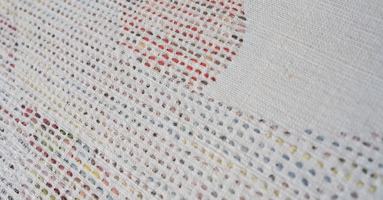 Straight stitches are incredibly versatile. In the work of Archana Pathak and Claire Wellesley-Smith, they prove to be elegant, uncomplicated and calm. For these artists, the power of straight stitch is in its meditative nature. Seed stitch, another repetitive stitch, is the preference of artists Claire Mort and Richard McVetis, who both like to revel in the slow process of making.