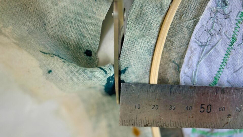 Trimming the excess fabric around the hoop