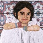 Aran’s Indian aesthetic is clearly present through her use of intricate appliqué and stitch. Bold colours are layered to create images of traditional garments and settings. Viewers can easily imagine the bustle of busy streets or the spices in the air that surrounds her portraits’ figures.