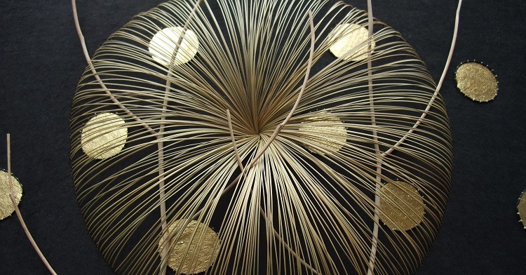 His UK-based allotment and garden and nearby park provide the fibres, and Kazuhito dries and fashions these into artworks that bridge the gap between Eastern and Western influences. There is a meditative quality in his patient and precise handiwork, which manifests as the piece transitions from 2D to 3D, the grasses, leaves and twigs being woven, or stitched and tied to traditional Japanese washi paper.