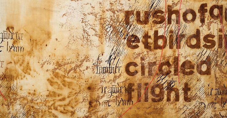 I then use a range of techniques and mediums to apply text to fabric or other substrate I’m using. Thermofax screens are a favourite as they allow me to print in different formats. I regularly use textile paint, puff paste, acrylic wax and rusting power, textile glue and transfer foils. I love the diversity of this printing technique, and once a Thermofax screen is made, it can be used indefinitely when handled with care.