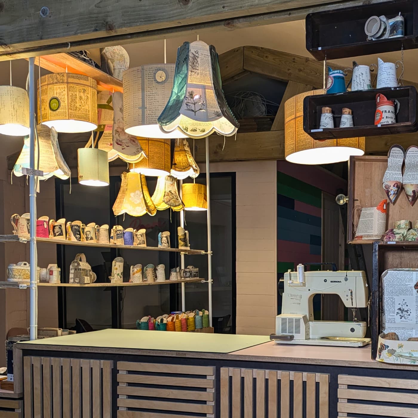 The retail area also doubles as storage. I have different sized recycled drawers for my sewing machine and haberdashery, that not only hide my stored equipment but also allow me to beautifully display my work on the front edge of my desk.