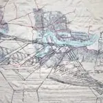 I used a smooth cotton fabric and placed masking tape over the top edge of the fabric to help it feed smoothly. Keeping the fabrics neutral allowed the colour to come from the map and the applied stitching. The images are stitched with freehand machine embroidery.