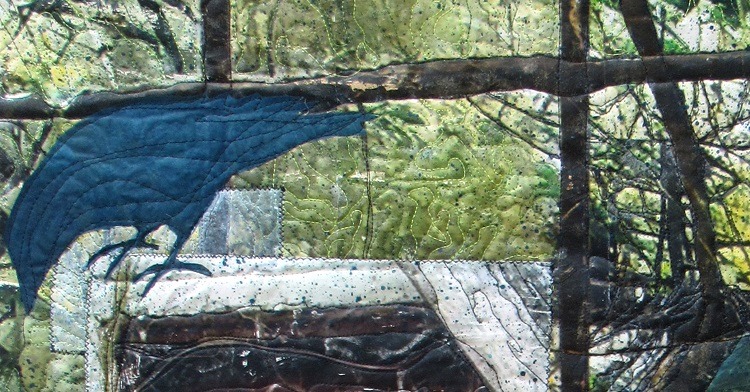 For this work, Sue first used Photoshop to create images suitable for making thermofax screens (like a silk screen) for printing. She then hand dyed and printed on top of cotton fabric using Procion dye and discharge paste. Next, she created a design on her computerised sewing machine to stitch on top of the printed fabric. Strips of voile were then appliquéd using free-motion stitching. Other fabrics were then added and removed to form the overall shape. Finally, the printed and stitched fabric was laid over wadding and a backing fabric and quilted together. The right-hand side falls forward intentionally to create a 3D effect.